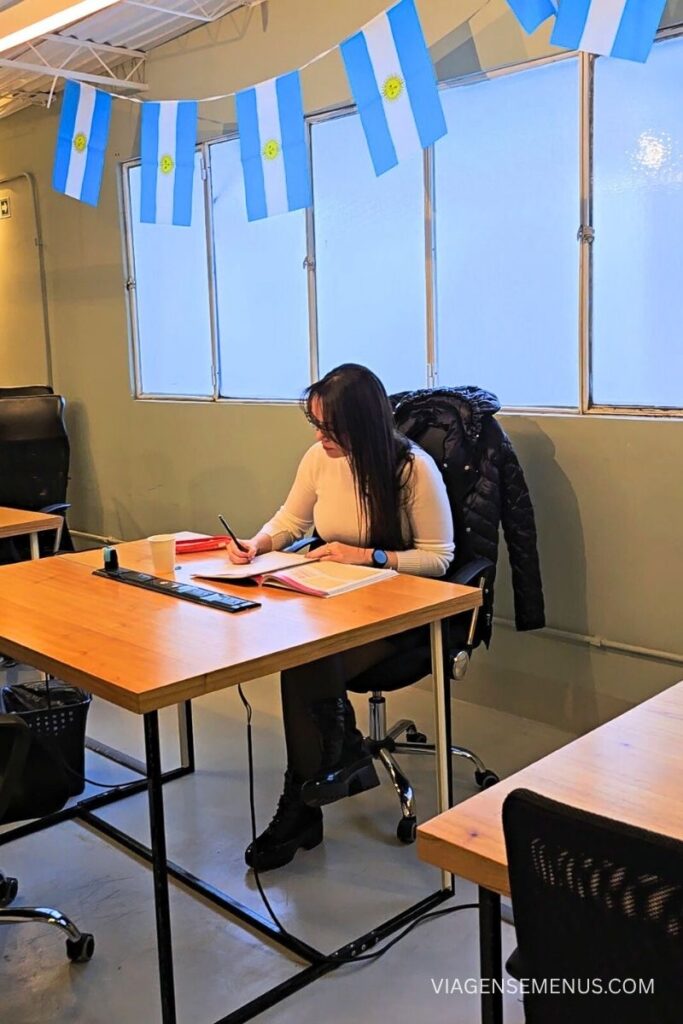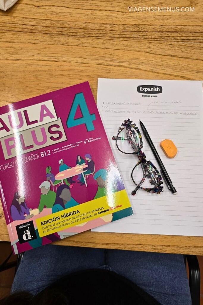 Mas o grande diferencial, e o que realmente nos conquistou, foi a possibilidade de estudar à noite. O curso noturno da Expanish Buenos Aires é pensado para adultos que já trabalham ou estudam durante o dia, perfeito para nós, que íamos trabalhar remoto em Buenos Aires.