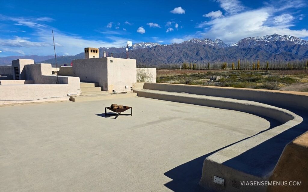 O terraço do hotel é uma espaço amplo com uma vista deslumbrante dos vinhedos com os Andes ao fundo, onde o hotel realiza alguns eventos esporadicamente.